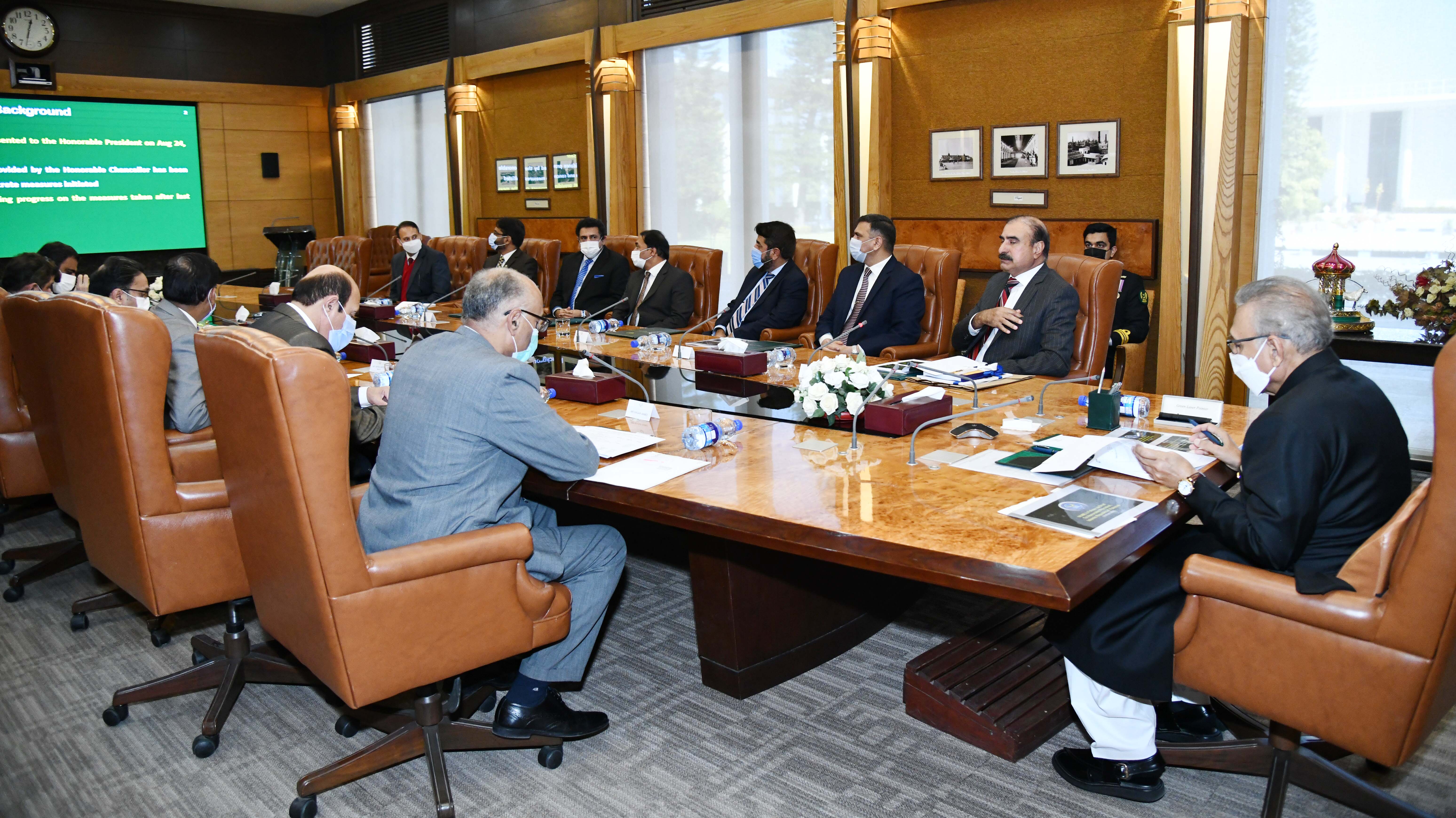 Islamabad, 10 February 2022: President Dr Arif Alvi has underlined the need for establishing community colleges to meet the educational and skill requirements of the country. He said that Pakistan was facing a shortage of skilled workforce and higher educational and technical institutions needed to focus on the skill development of human resources. He expressed these views while chairing a follow-up meeting on the National University of Modern Languages (NUML), Islamabad, at Aiwan-e-Sadr, today.